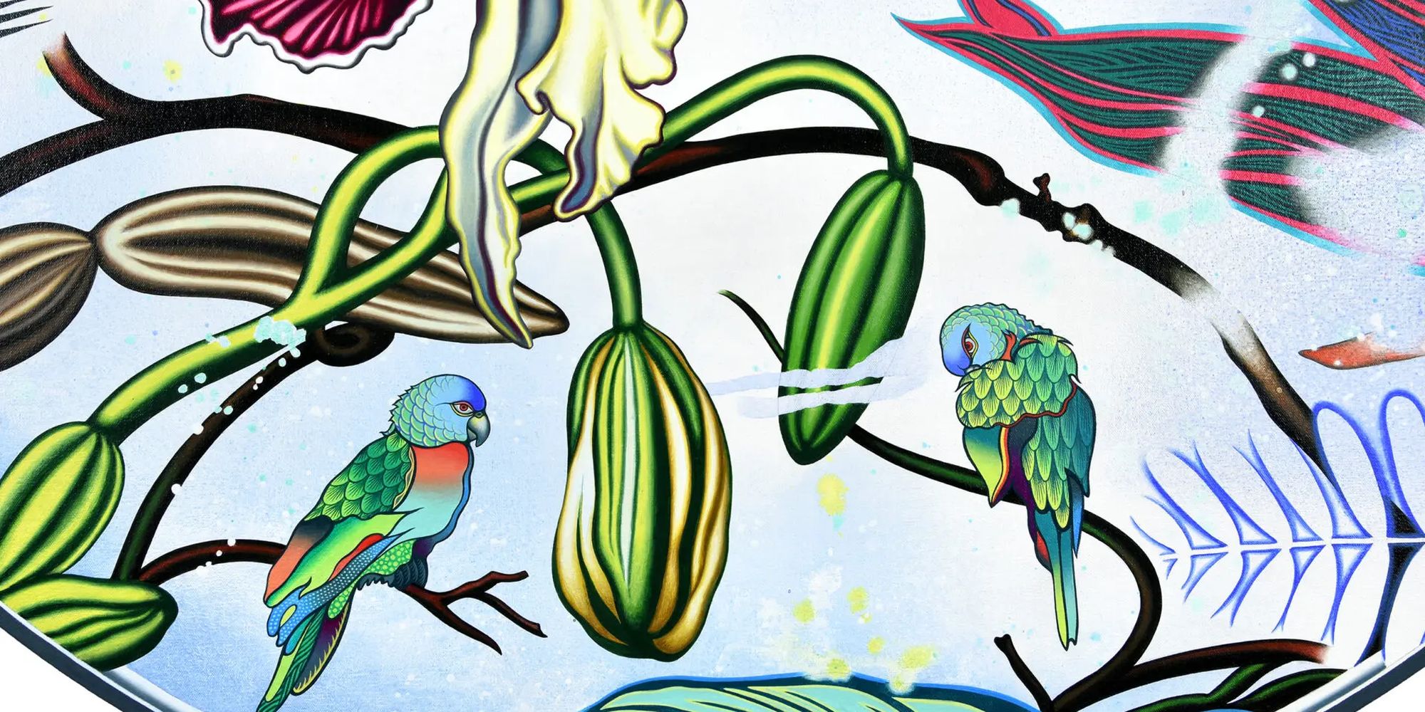 Art Opening: Peter Gerakaris, Saturday, January 17th at 4pm. In his latest exhibition entitled Oculus Serenade, Peter D. Gerakaris’s selection of vibrant tondo paintings literally and figuratively focus the gaze on our wondrous natural world, merging microcosmic and macrocosmic apertures. As luminous portals, the works present motifs such as endangered botanicals, exotic avian species, topographical forms, and aquatic life — which the artist has experienced firsthand whether trekking in semi-tropical jungles, scuba diving amongst fragile coral reefs, or hiking along the Housatonic in Cornwall. These oculi reverberate like stereographic, kaleidoscopic lenses that meld nature and culture.