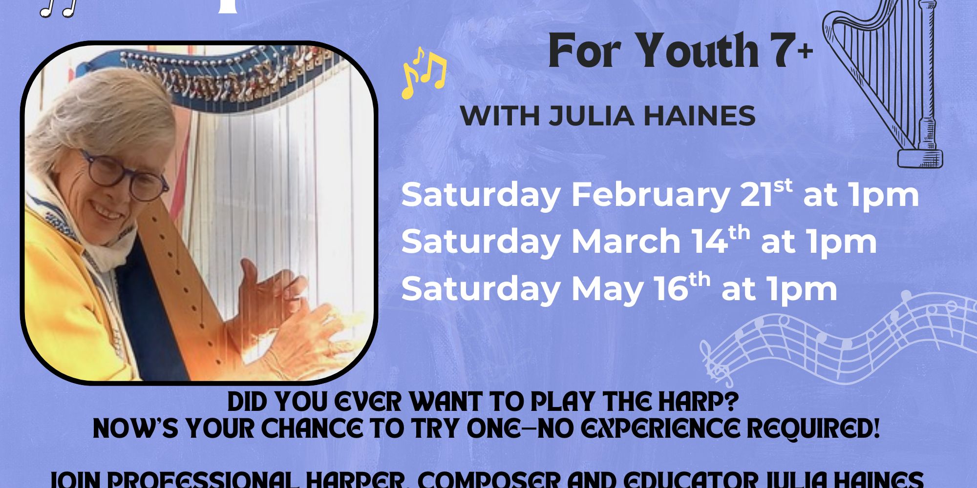 Join professional harper, composer and educator Julia Haines for a hands-on introduction to the harp. Using a 22-string student harp, you’ll learn basic techniques and discover the magic of this beautiful instrument.