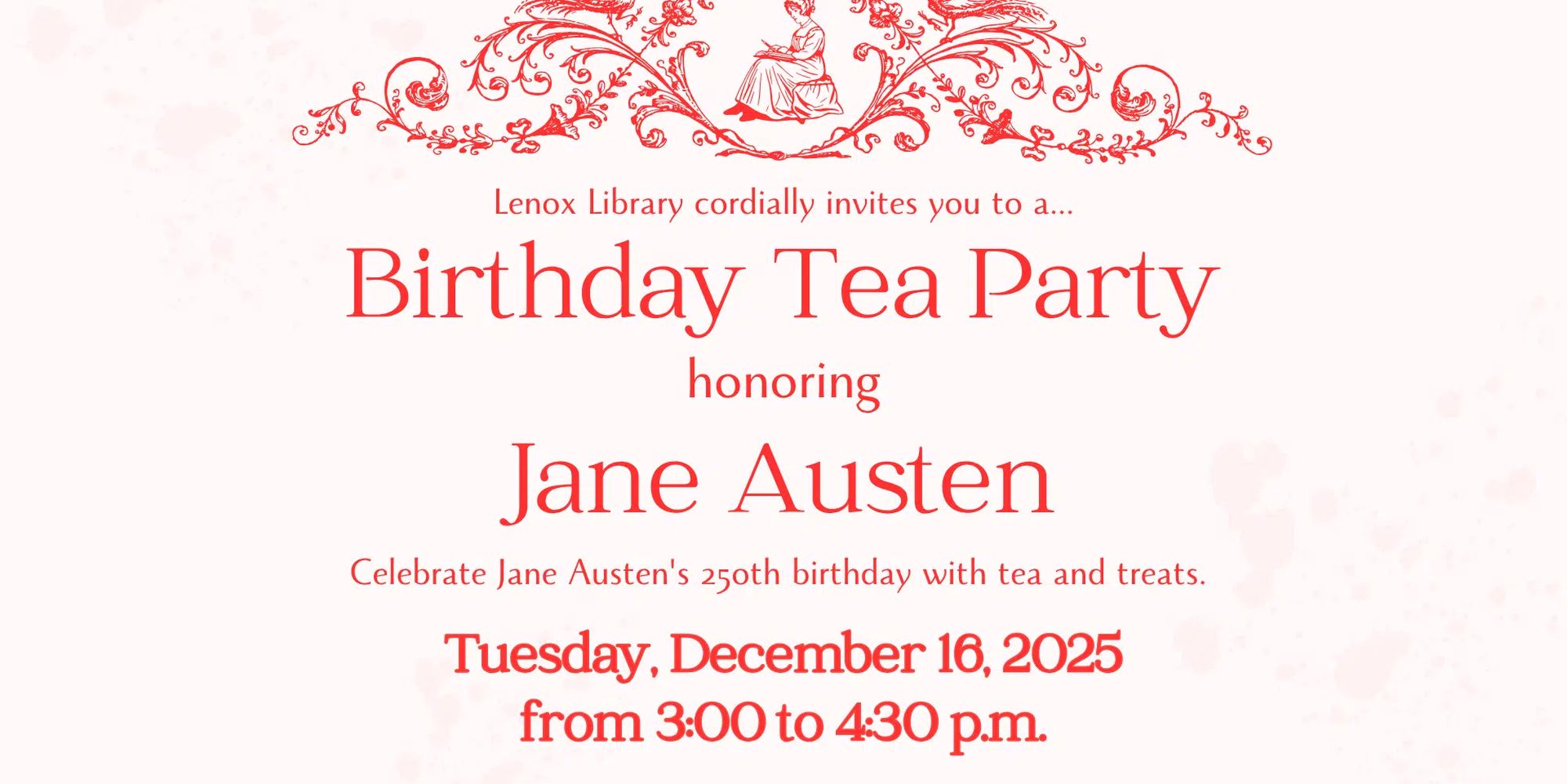Celebrate Jane Austen’s 250th birthday with tea and treats at the Lenox Library on Tuesday, December 16 from 3:00 to 4:30 p.m. All are welcome to the Welles Gallery. Seating is limited, so please make a free reservation by clicking HERE.
