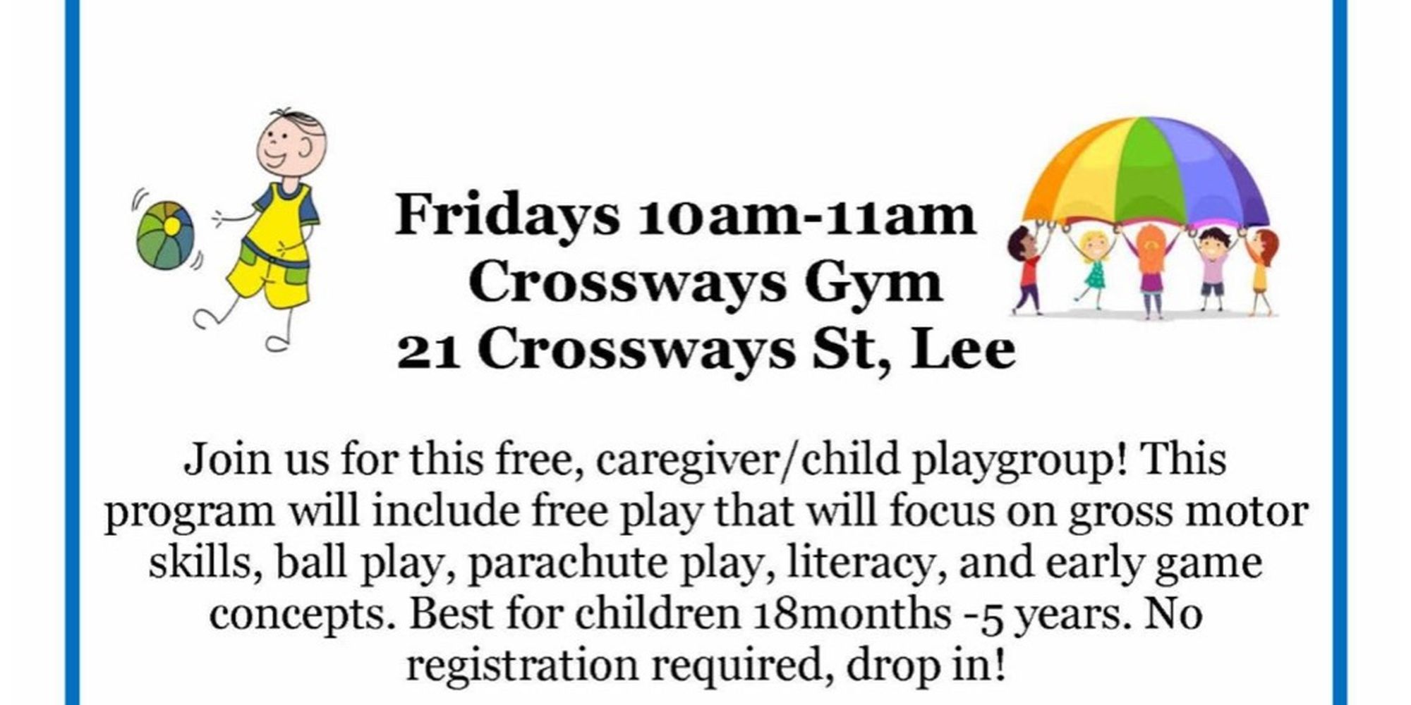 Join us for this free, caregiver/child playgroup! This program will include free play that will focus on gross motor skills, ball play, parachute play, literacy, and early game concepts. Best for children 18months -5 years. No registration required. Drop in!