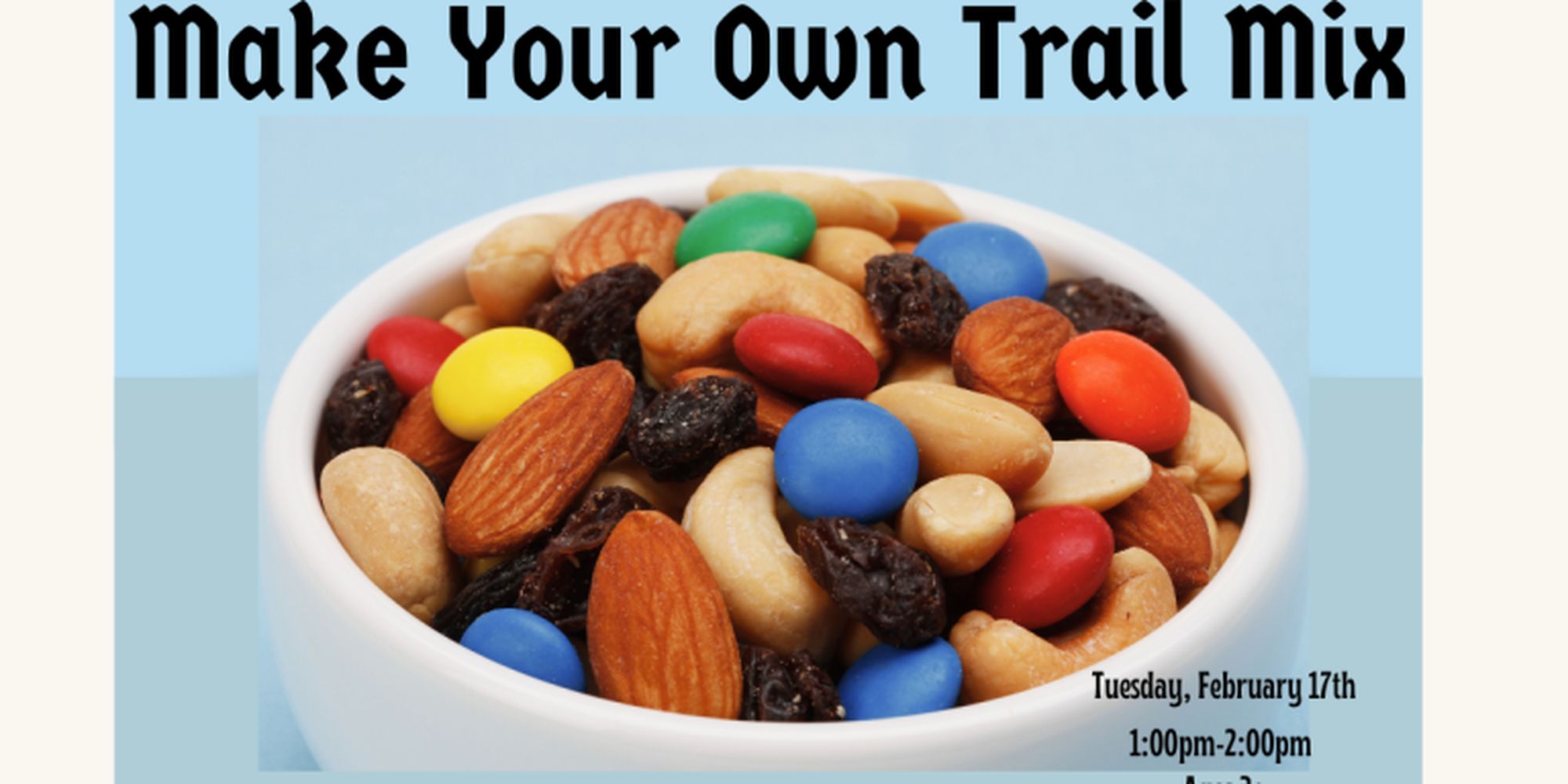 Create your own tasty trail mix at the library! Children ages 3 and up are invited to mix, match, and snack while exploring fun flavors and textures in this hands-on activity. A delicious way to enjoy learning, sharing, and creativity together.