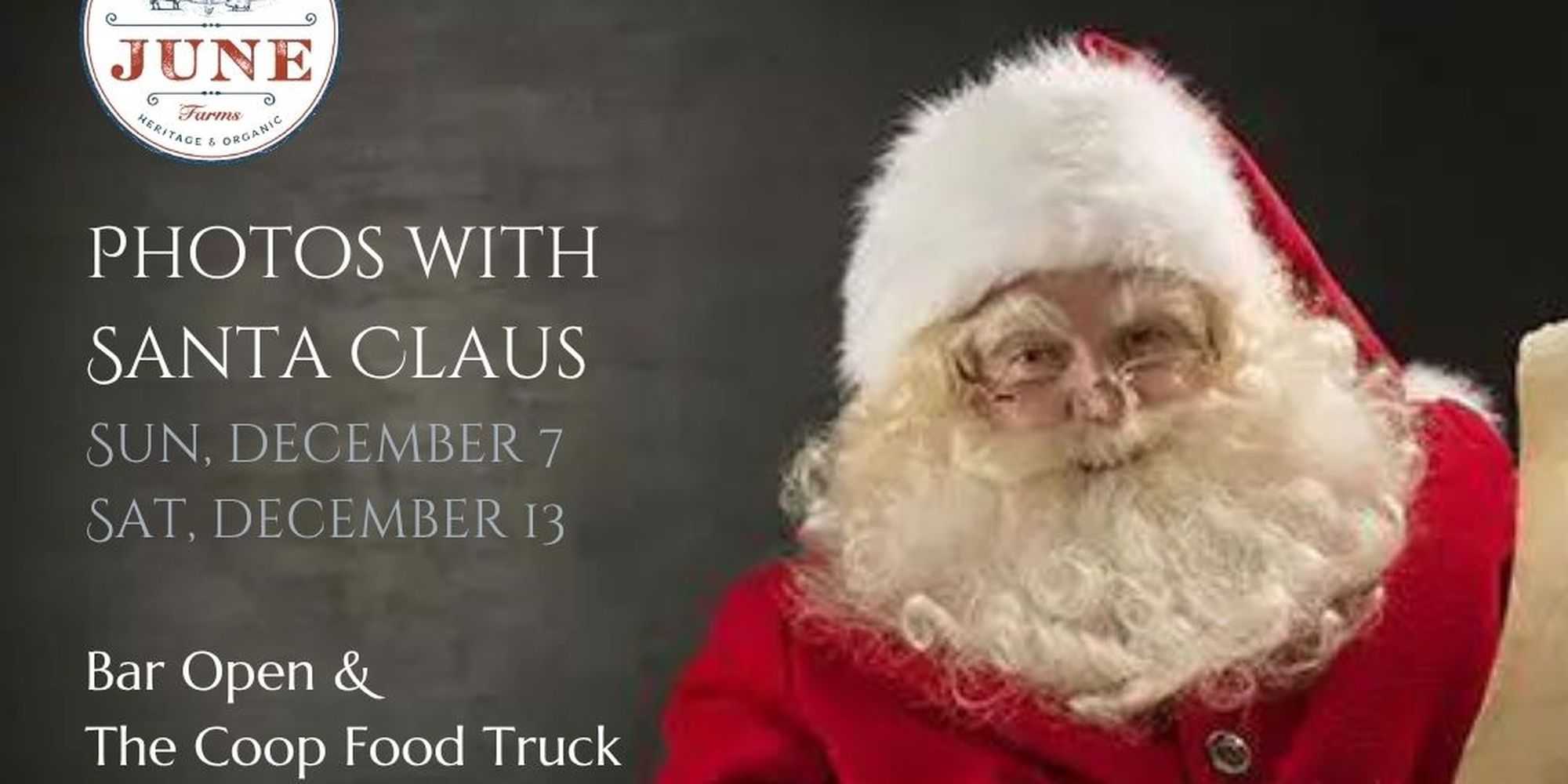 Join us at June Farms for a magical holiday experience when Santa Claus comes to visit the farm on Saturday, December 7 and Saturday, December 13 from 10am–4pm!