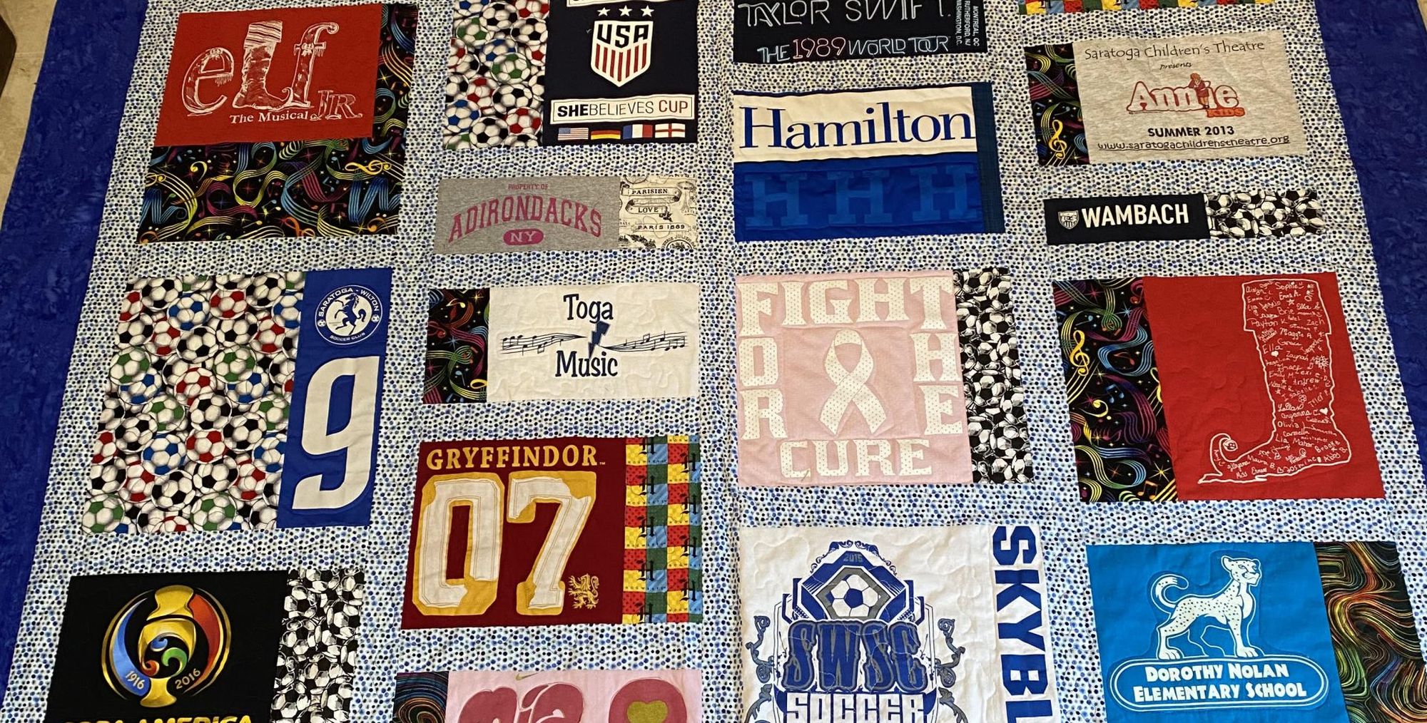 In this class students will learn how to cut and stabilize t-shirts to be used in a "memory" t-shirt quilt. Some editing of materials may be necessary. Guidance for fabric choices of sashing and background colors will be given. On day 2 students will lay out and size their blocks and begin sewing. Options for quilting will be discussed. On day 3 students will finish their quilts by applying the borders, binding and label. Homework will be assigned between each class date. Students will need to bring their own t-shirt collection, a rotary cutter and cutting mat for day 1. Materials for days 2 & 3 will be discussed during class. Some knowledge of sewing/quilting is helpful.