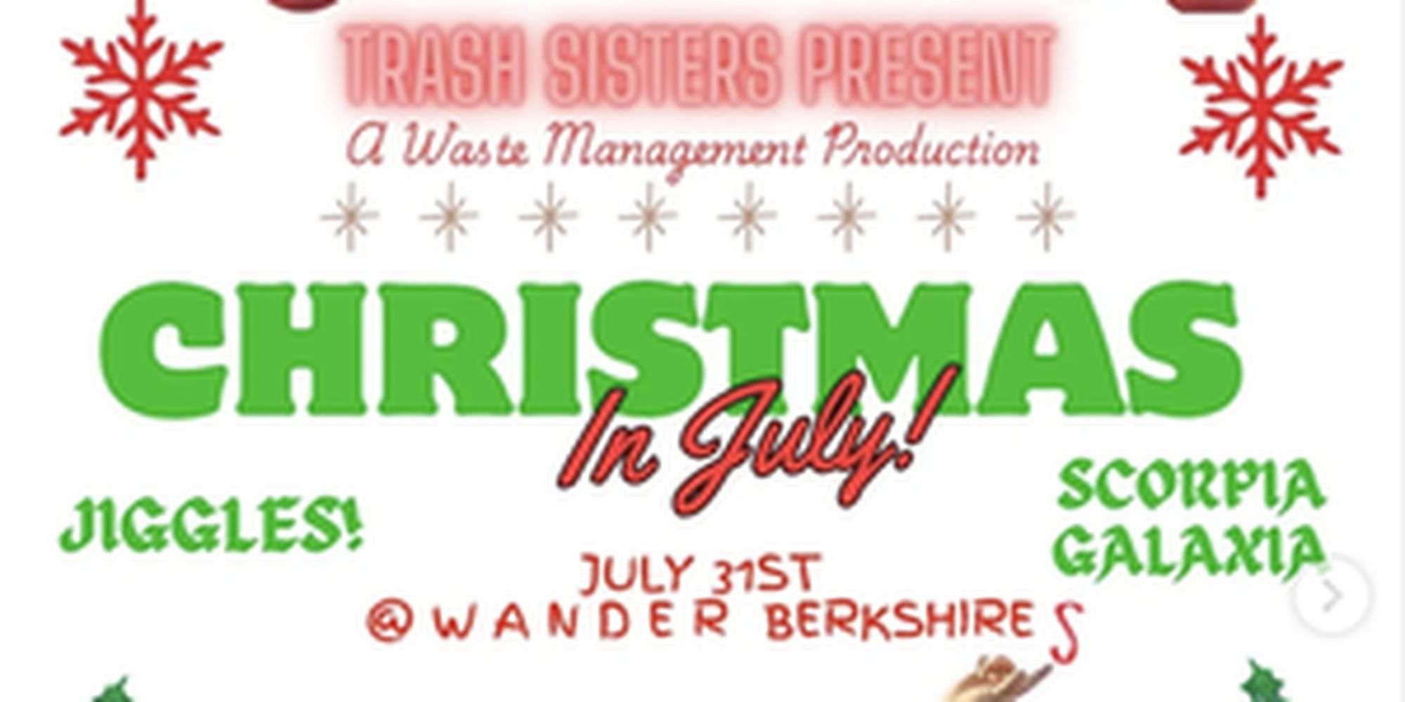 Escape the summer heat and chill out with frosty festivities, uproarious laughs, and gasp-worthy cameos.. Join the Trash Sisters for a one-of-a-kind celebration—tinsel, tunes, and tongue-in-cheek merriment guaranteed!