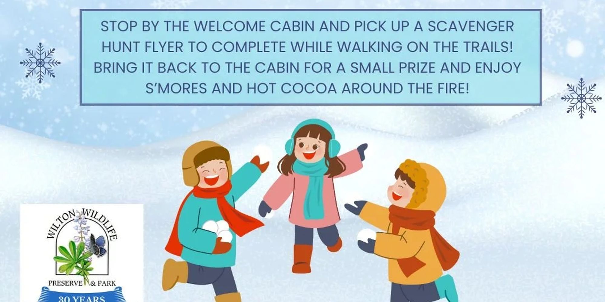 Stop by the Welcome Cabin and pick a scavenger hunt flyer to complete while walking on the trails! Bring it back to the cabin for a small prize and enjoy s’mores and hot cocoa around the fire!
