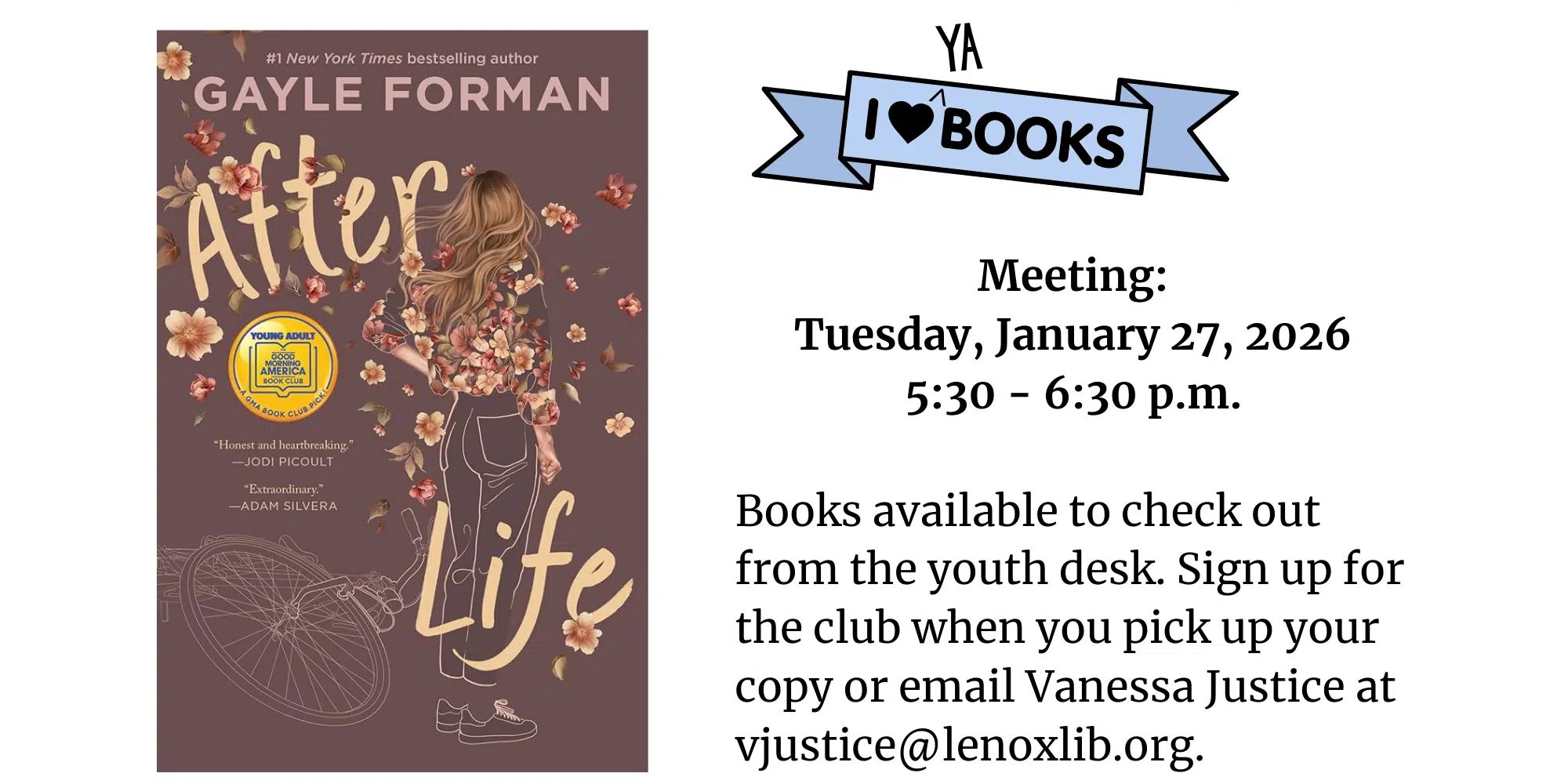 Do you love reading Young Adult books? Join our monthly YA for Adults Book Club to discuss new and classic titles! January’s meeting will take place January 27, 2026, 5:30 – 6:30 p.m. to discuss After Life by Gayle Forman. Books available to check out from the youth desk. Sign up for the club when you pick up your copy or email Vanessa Justice at vjustice@lenoxlib.org. Meets the last Tuesday of the month.
