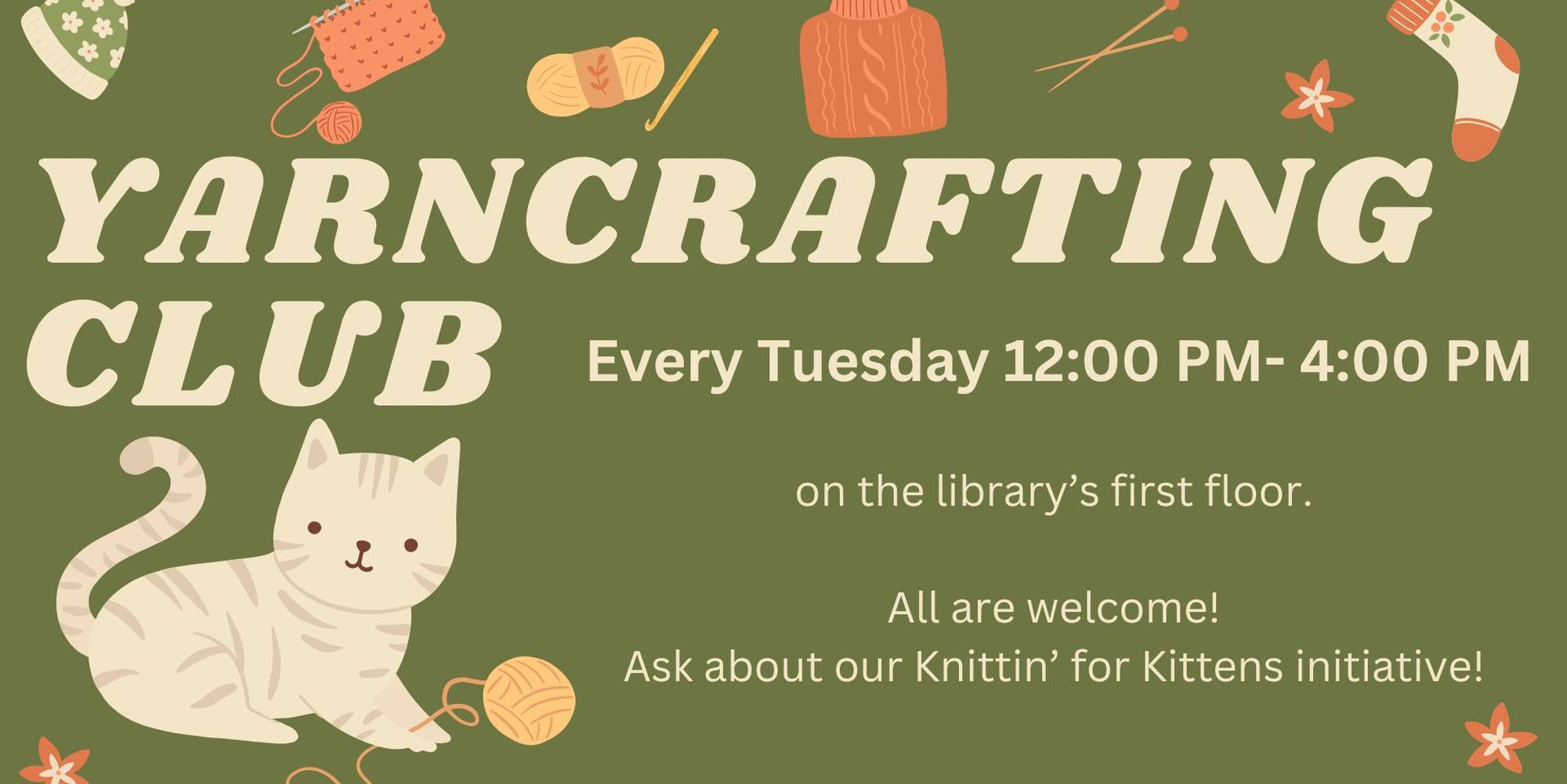 Calling all knitters, crocheters, and yarncrafters! Work on your projects in the company of other fiber fanatics at the library! Every Tuesday from 12:00 PM to 4:00 PM on the library's first floor.