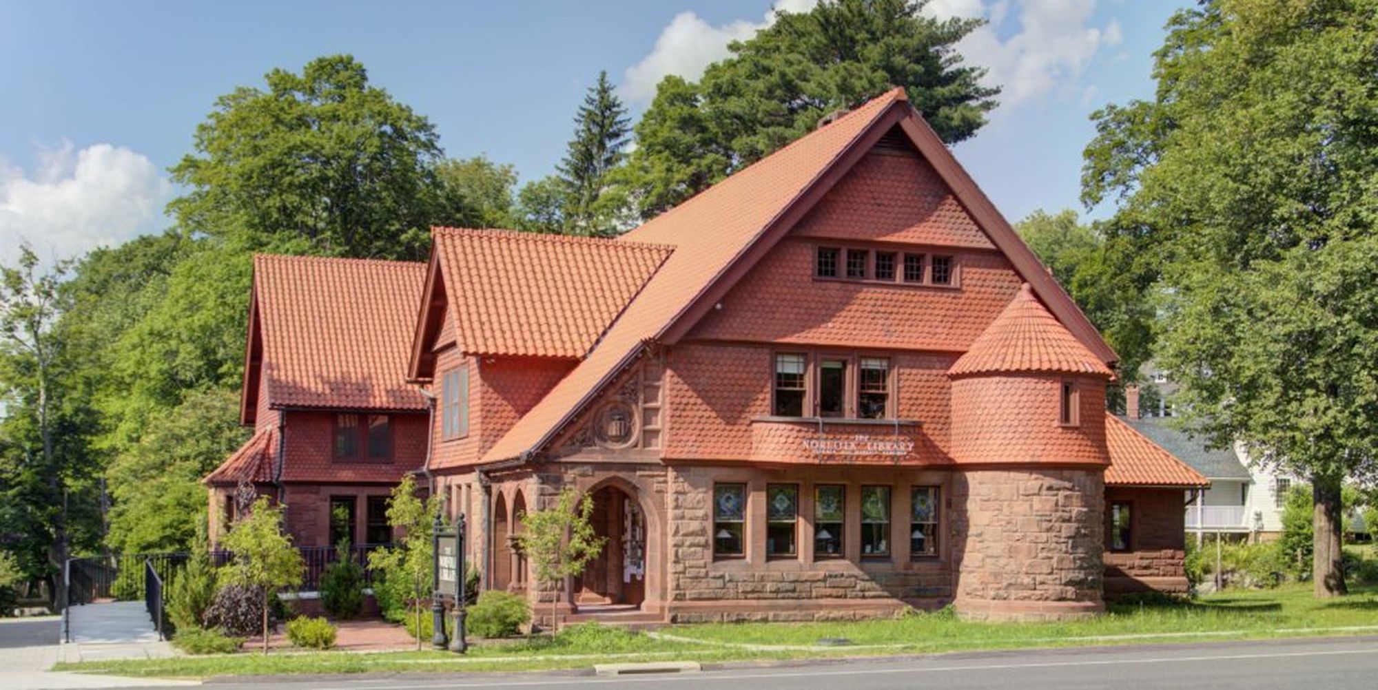 The Norfolk Library, also known as Eldridge Memorial Library, is a library at 9 Greenwoods Road East in Norfolk, Connecticut. The Norfolk Library is a private charitable organization, but the facility is open to the general public. Designed by architect George Keller in 1888, and greatly expanded by Keller in 1911, it is an outstanding example of Shingle Style architecture. The building is a contributing property in the Norfolk Historic District.